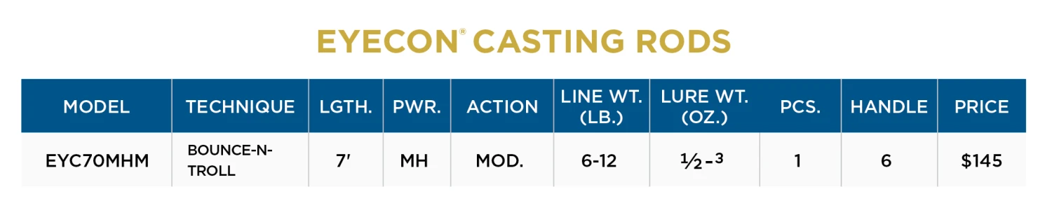 Walleye anglers take notice – Eyecon is walleye centric to its core. Created to give walleye anglers the upper hand regardless the technique. Engineered with a new modified split handle configuration on most models as well as customized technique specific foregrips, Eyecon brings balance and light weight versatility to your arsenal.